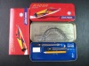 methematical set including 1 divider, 1 compass, 4 pcs ruler,1sharpener,1 eraser, 1 pencil, PVC inlay,tin box and paper cover. OEM are welcome